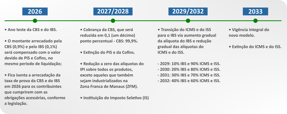 - Transição do ICMS e do ISS para o IBS via aumento gradual da alíquota do IBS e redução gradual das alíquotas do ICMS e do ISS;