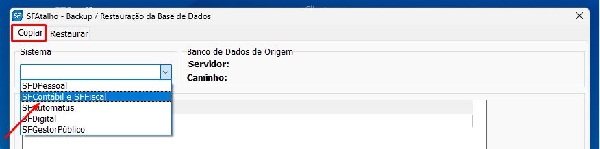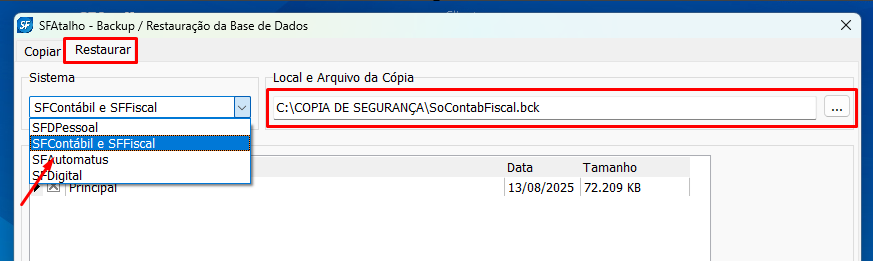 1. No SFAtalho, clique em Utilitários > Cópias de Segurança;