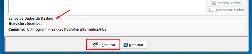 8. Na parte inferior o sistema indicará o local onde a cópia será restaurada (Servidor + Caminho). Clique em Restaurar para iniciar o processo.