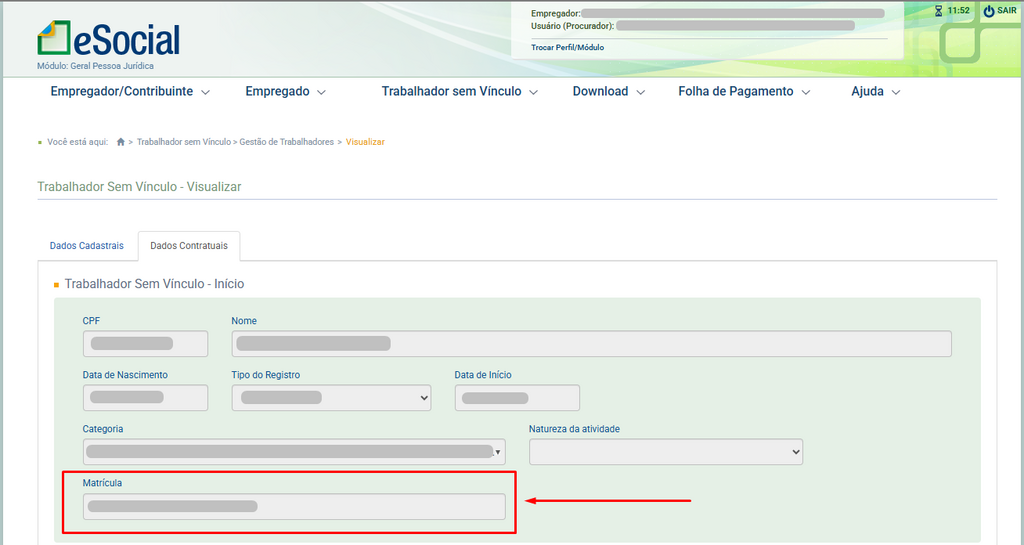 A exigência da matrícula para trabalhadores sem vínculo tornou-se obrigatória a partir da implantação do leiaute simplificado 1.0 do eSocial. Até então, essa informação não era obrigatória, o que resulta na existência de cadastros anteriores sem a devida matrícula registrada.
