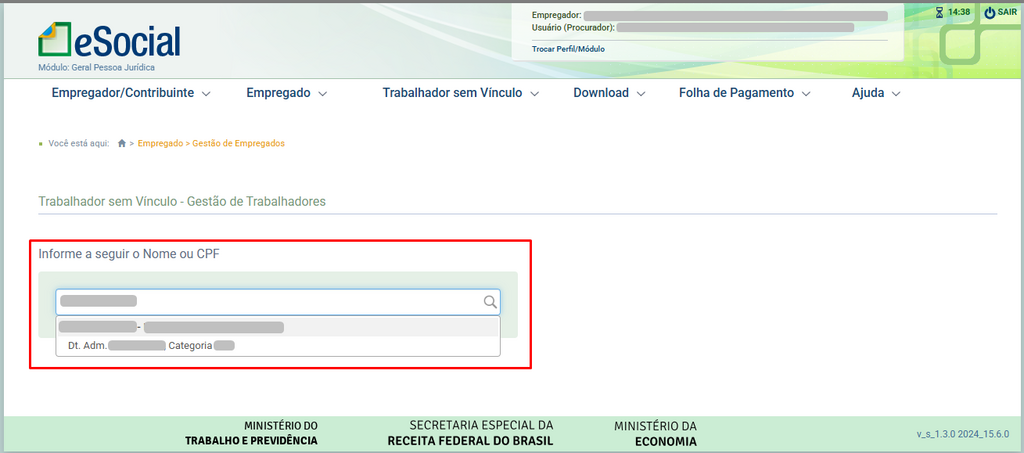 1. Acesse o portal do eSocial e navegue até Trabalhador sem vínculo > Gestão de Trabalhadores.