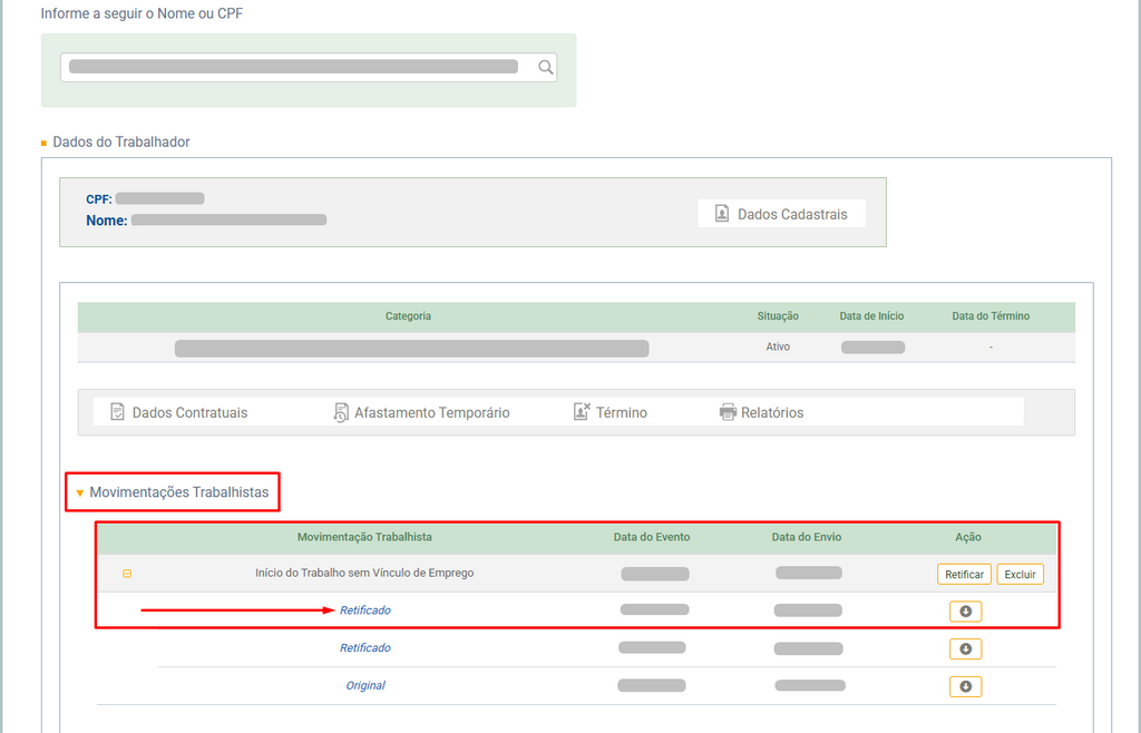3. Acesse a seção Movimentações Trabalhistas e, em seguida, selecione a opção Início do Trabalho sem Vínculo de Emprego. Nos casos em que houver retificação do evento, selecione a opção Retificado.
