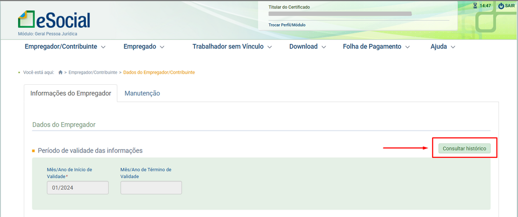 - Acesse a seção Dados do Empregador dentro do Portal do eSocial e, em seguida, clique no botão Consultar Histórico.