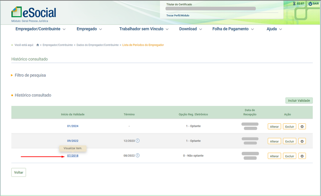 Para garantir que as vigências dos cadastros no SFDPessoal estejam compatíveis com as registradas no eSocial, é necessário acessar a opção Dados do Empregador dentro do Portal do eSocial. Em seguida, acesse o Histórico para visualizar as vigências cadastradas, relativas ao cadastro da empresa. Esse processo é fundamental para dar continuidade ao envio dos eventos ao eSocial. Vale ressaltar que, caso exista apenas uma vigência cadastrada, o procedimento descrito abaixo não será necessário.