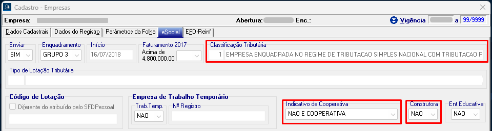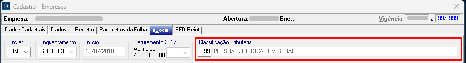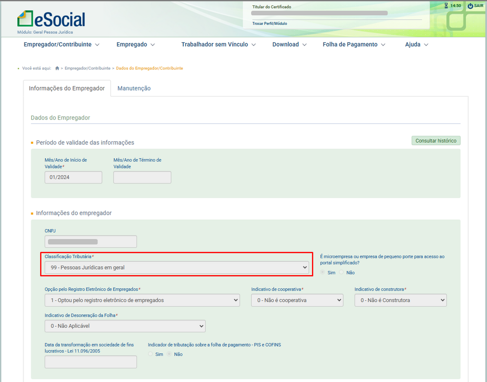 - Volte no Portal do eSocial, e acesse a última vigência do cadastro. Agora a alteração ocorreu no campo Classificação Tributária, onde era o código 1 e agora está com o código 99.