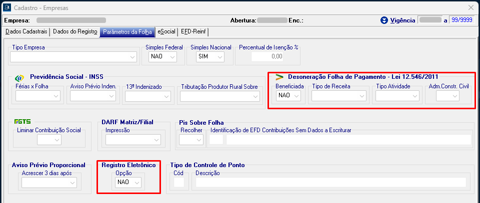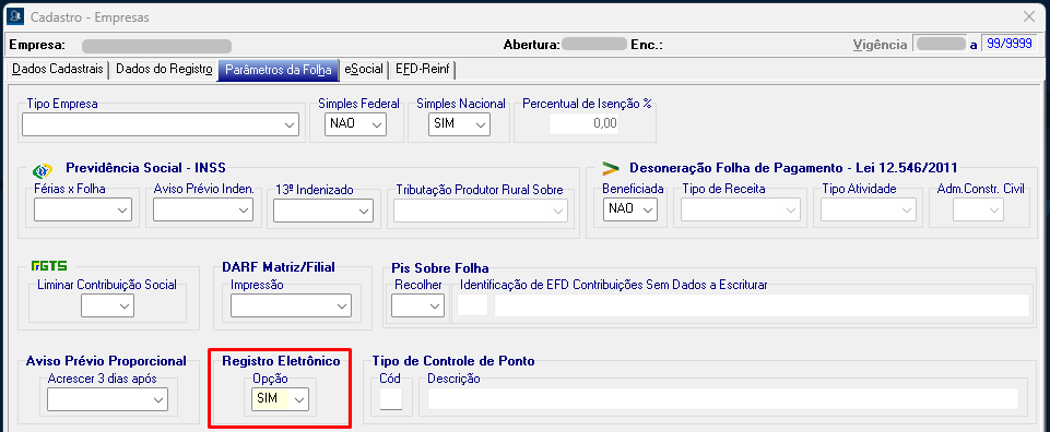 - Agora no sistema SFDPessoal, altere o campo Registro Eletrônico dentro do cadastro da empresa. Ao confirmar novamente aparecerá a tela de Controle de vigência, porém desta vez deverá ser selecionada a opção Baixar a vigência atual em __/____ e criar uma nova em vigência a partir de __/____ a 99/9999. No campo habilitado para a digitação da vigência, altere para a segunda vigência que estamos incluindo, neste caso 09/2022 e confirme.