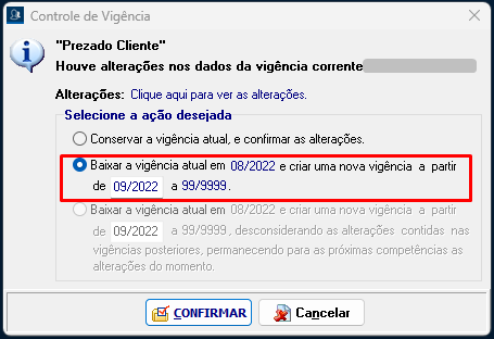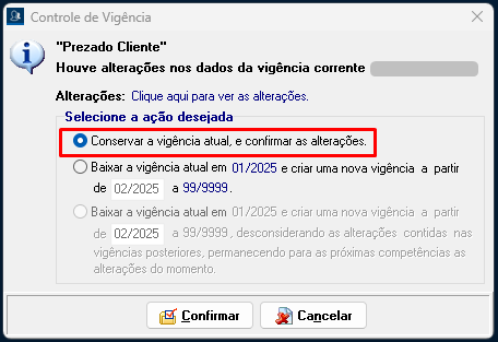 - Ao confirmar a alteração do cadastro, o sistema apresentará a tela de Controle de vigência, onde terão as opções: Conservar a vigência atual, e a opção Baixar a vigência atual em __/____. Nesta primeira vigência você deverá marcar a opção Conservar a vigência atual, e confirmar.