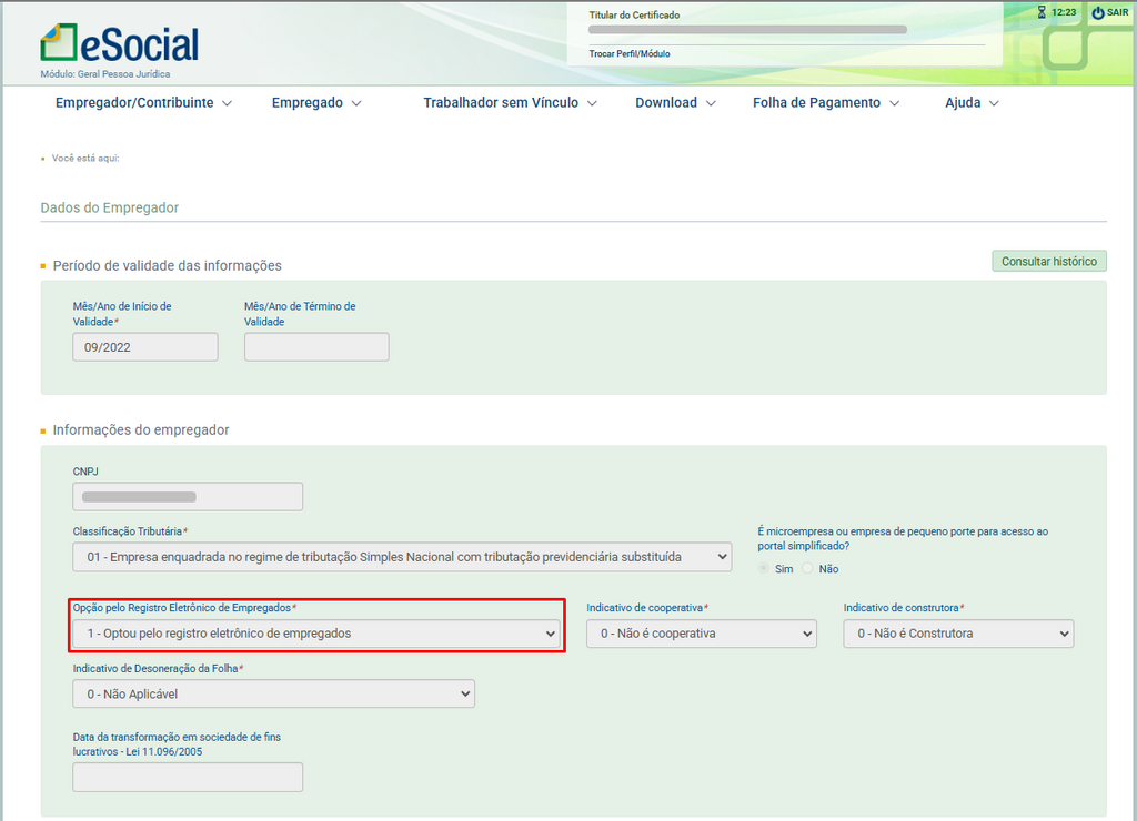- Acesse novamente o Portal do eSocial e consulte o cadastro da vigência seguinte, que neste caso é 09/2022. Dessa forma, será possível verificar as alterações realizadas em relação ao cadastro anterior. Observe que, neste caso, o campo 'Registro Eletrônico', que antes estava vazio, agora está preenchido com 'SIM
