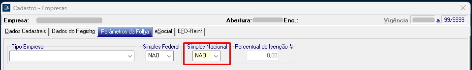 - Acesse o cadastro da empresa no SFDPessoal, altere o campo "Simples Nacional" para NÃO e, no campo "Classificação Tributária", modifique para 99. Em seguida, confirme a alteração. A tela de Controle de Vigência será exibida novamente. Selecione a opção "Baixar a vigência atual em __/____" e crie uma nova vigência a partir de __/____ até 99/9999. No campo correspondente à vigência, altere para a terceira vigência que estamos incluindo, que neste caso é 01/2024, e confirme.