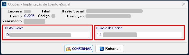 6. Na tela de implantação, preencha os campos com o ID do evento e o número do recibo copiados do portal do eSocial.