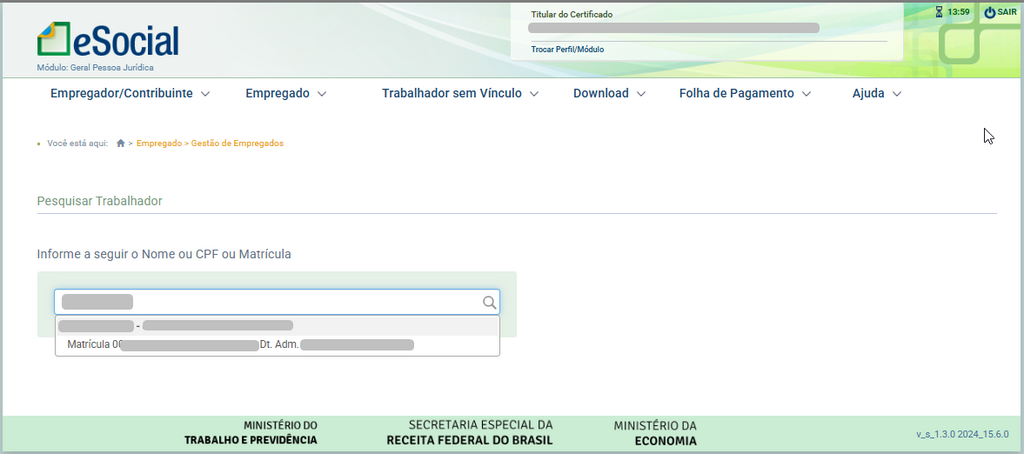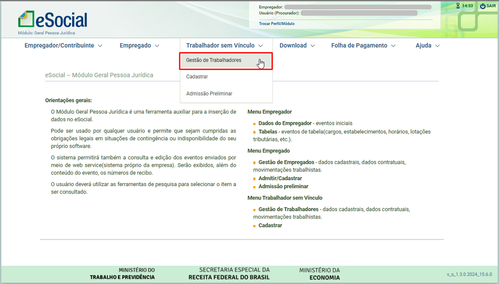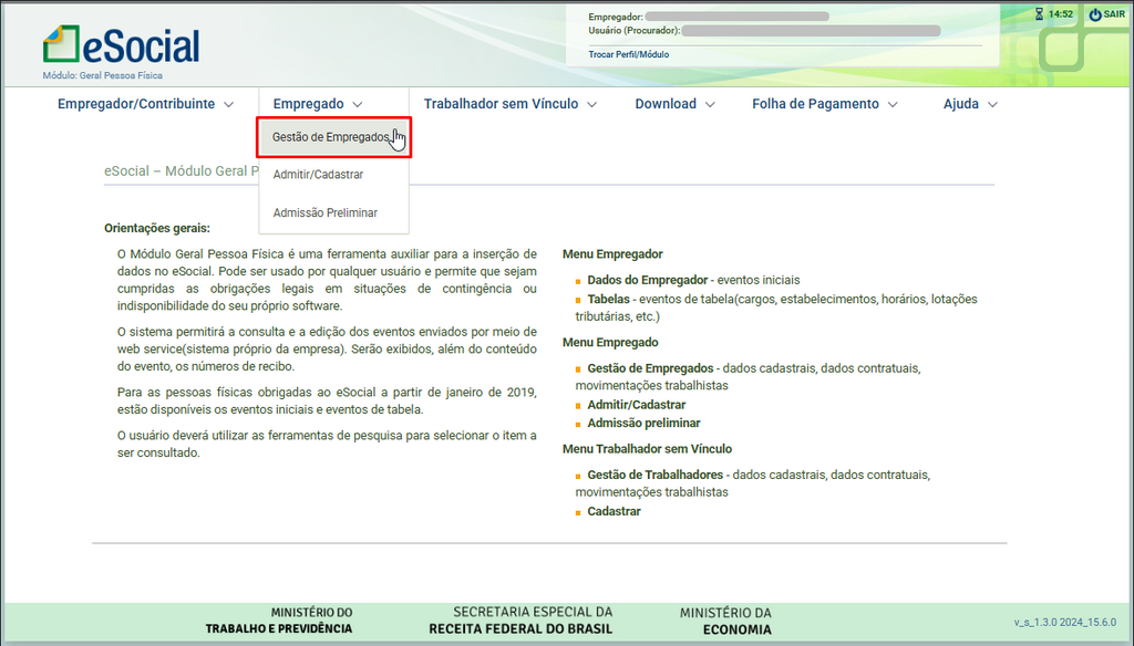 - Acesse o portal do eSocial e vá em Empregado > Gestão de Empregado, ou caso se trate de um trabalhador sem vínculo, clique em Trabalhador sem Vínculo > Gestão de Trabalhadores.