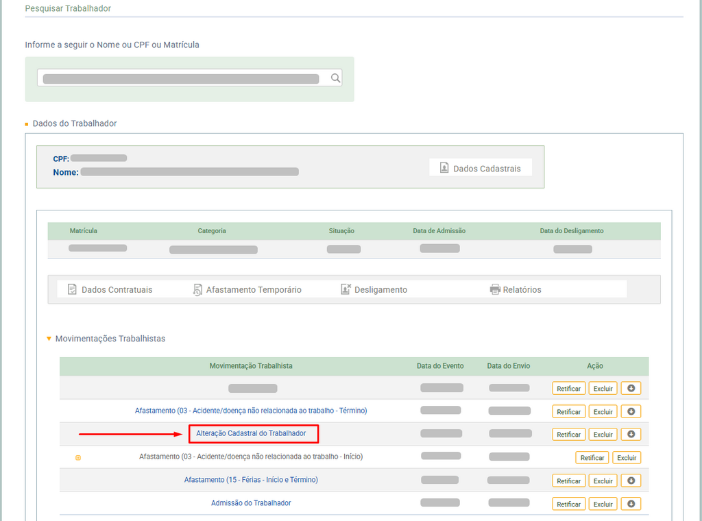 3. Clique em Movimentações Trabalhistas. Em seguida, selecione a opção Alteração Cadastral.