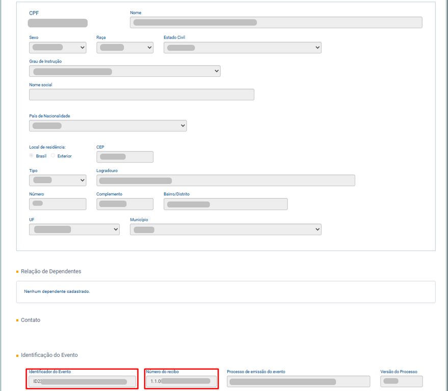 4. No final da tela, localize os campos Identificador do Evento e Número do Recibo. Copie esses dois valores.