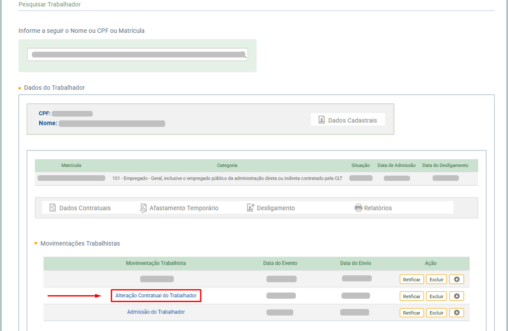 3. Clique em Movimentações Trabalhistas e selecione a opção Alteração Contratual do Trabalhador.