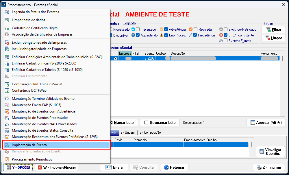 5. No sistema SFDPessoal, acesse o menu Processamento > eSocial > Eventos. Localize o evento S-2206, clique em Opções > Implantação de Eventos.