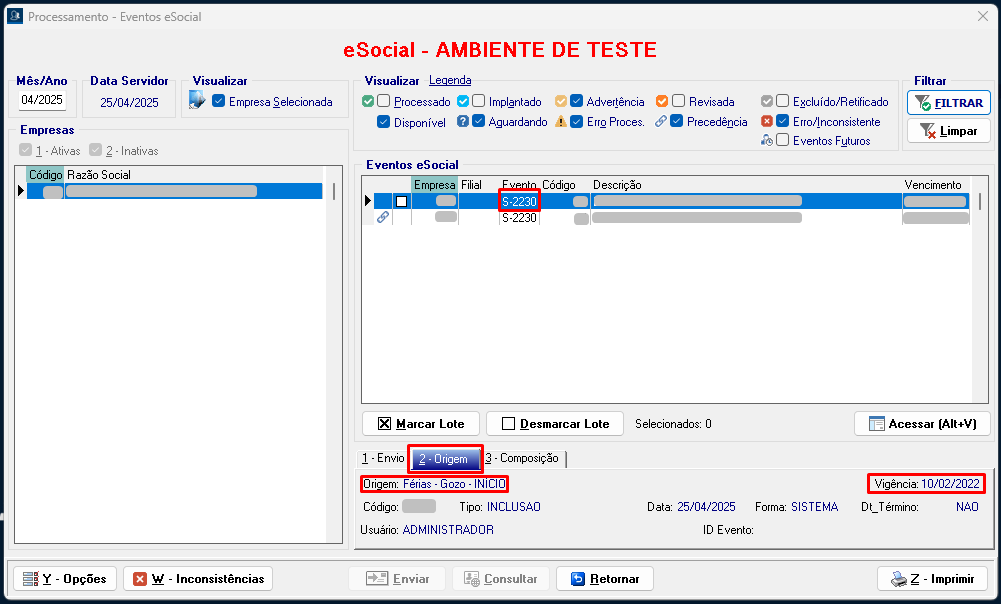 Localize o evento S-2230, clique sobre ele e, na aba Origem, verifique as informações detalhadas.