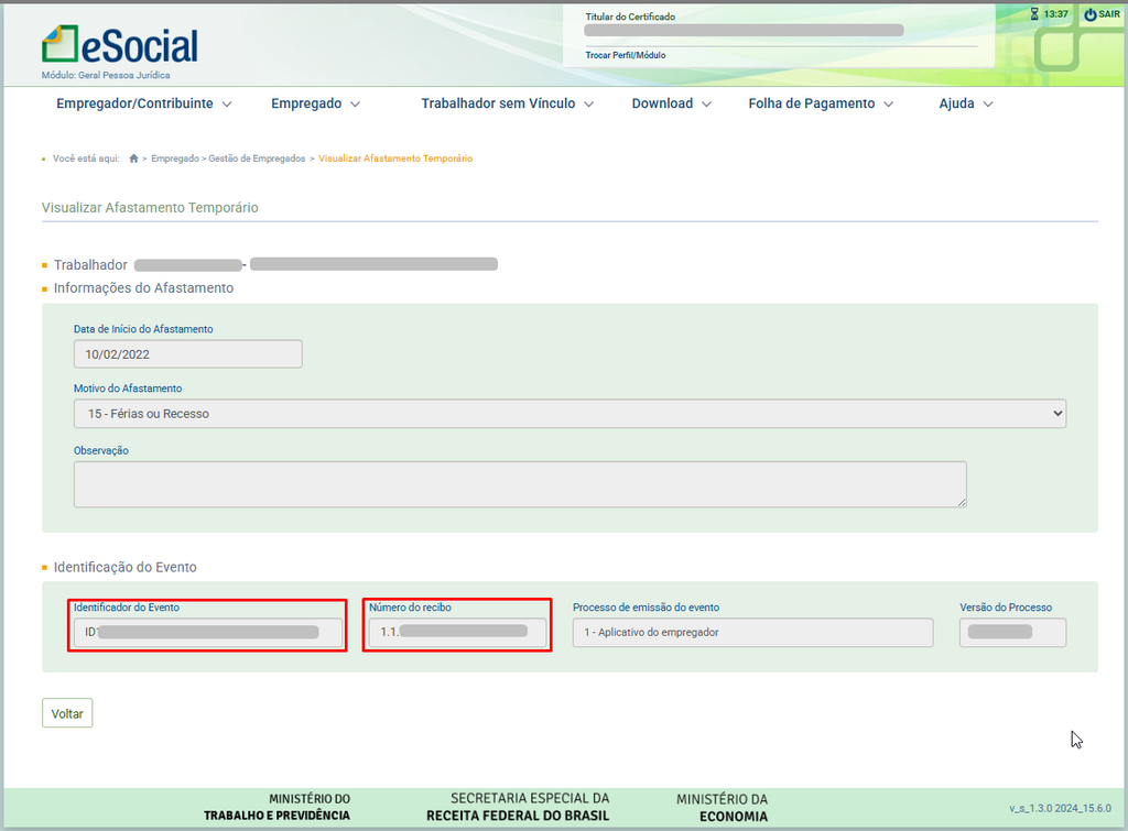 5. Copie os campos Identificador do Evento e Número do Recibo, que serão utilizados na etapa de implantação no sistema.