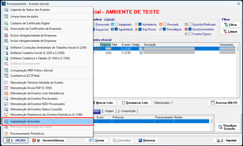 6. Retorne ao sistema SFDPessoal, acesse o Processamento dos Eventos do eSocial, localize e selecione o evento S-2230. Em seguida, clique em Opções > Implantação de Eventos.