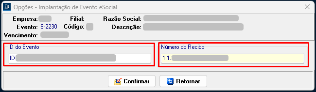 7. Preencha os campos com os dados copiados anteriormente (Identificador do Evento e Número do Recibo) e confirme a operação para concluir a implantação.