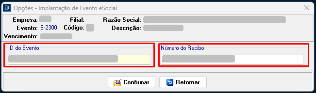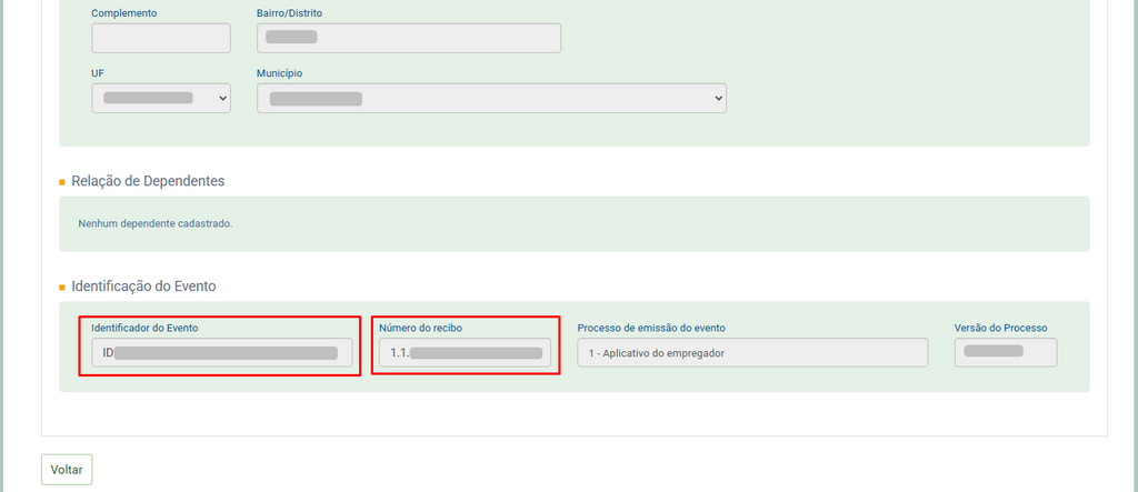 4. Ao final da tela, localize os campos Identificador do Evento e Número do Recibo. Anote essas informações, pois serão necessárias para a transcrição no sistema SFDPessoal.