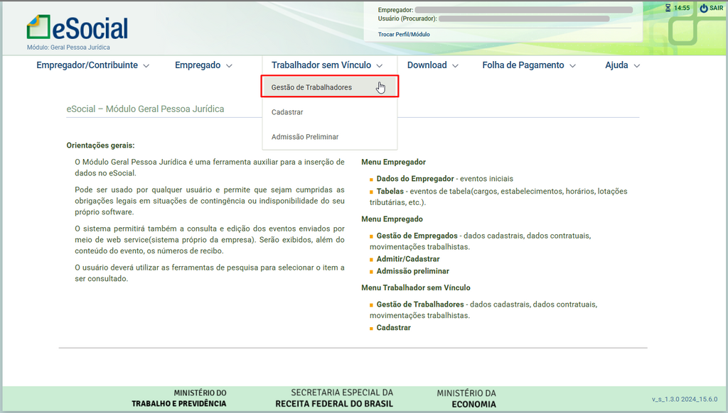 1. Acesse o portal do eSocial e selecione o menu: Trabalhador sem vínculo > Gestão de Trabalhadores.