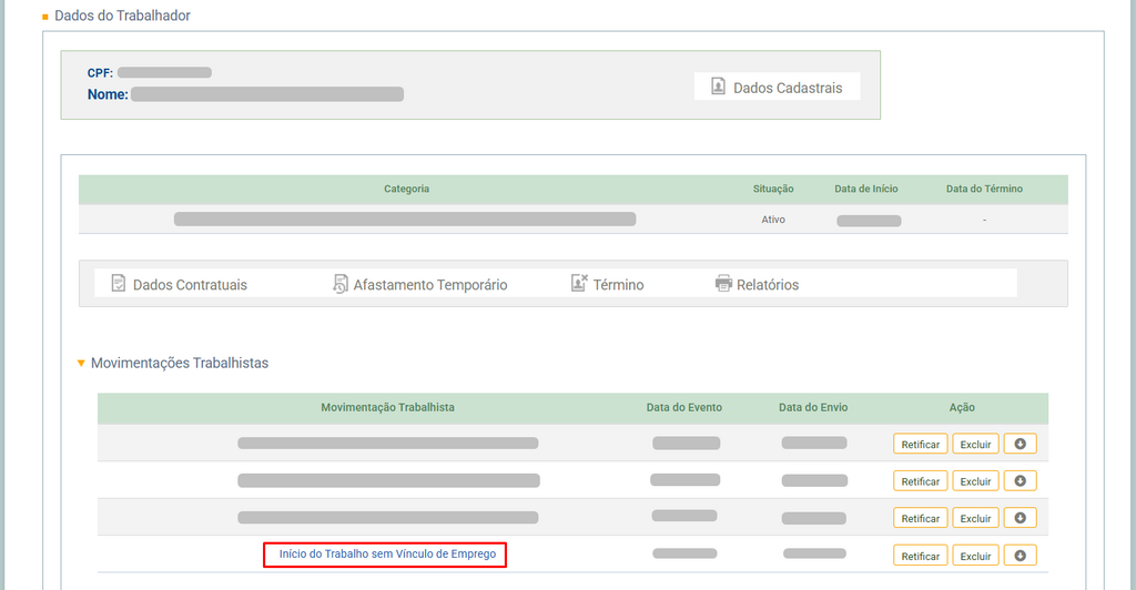 3. Clique em Movimentações Trabalhistas, em seguida em Início do Trabalho sem Vínculo.