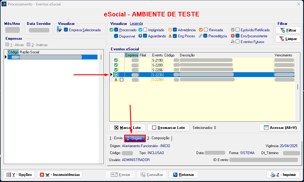 4. Observando os eventos processados, consta o evento S-2230 afastamento temporário: