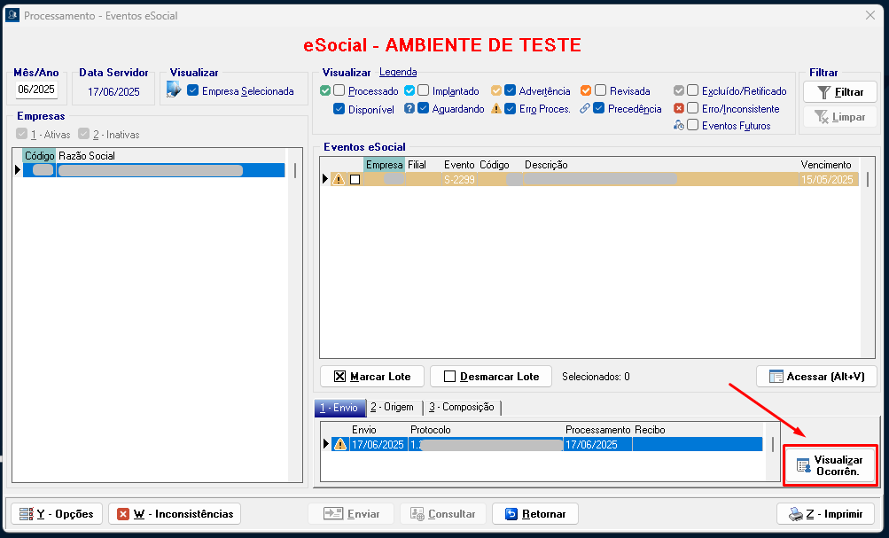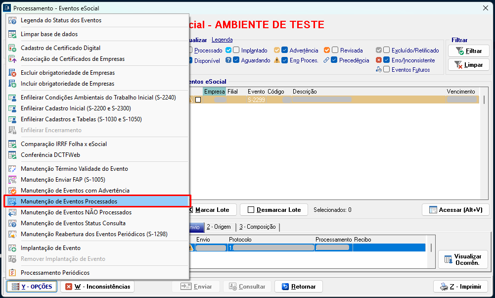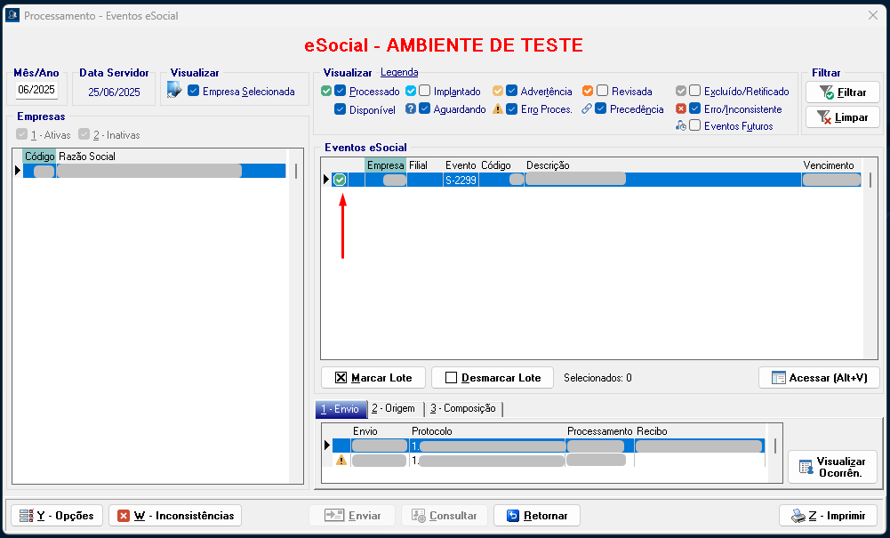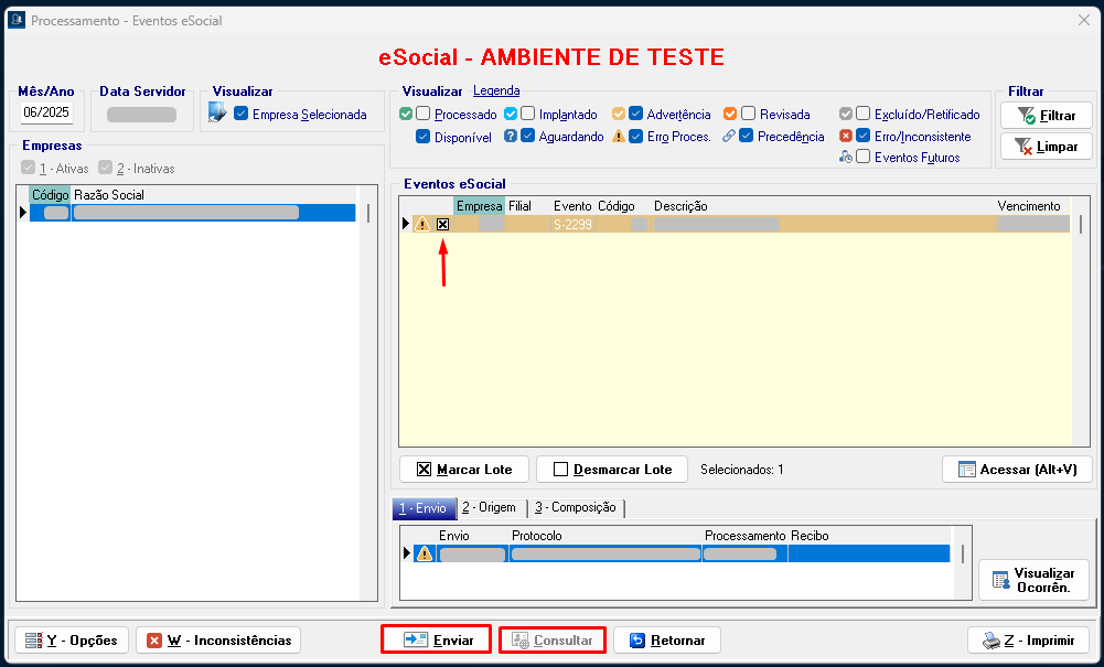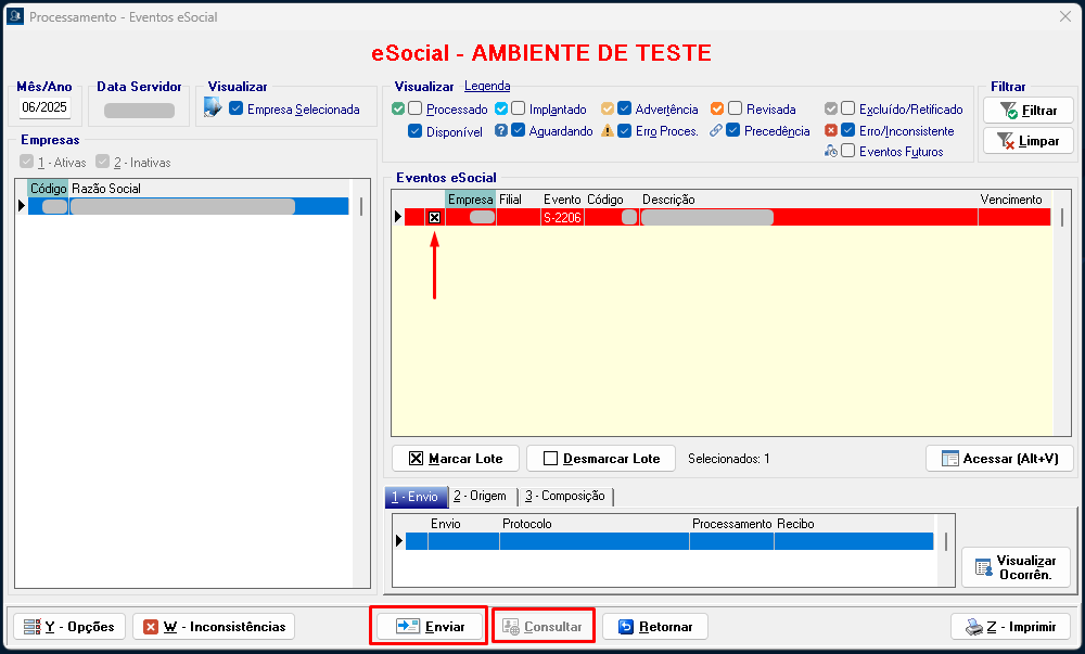 • Marque o evento, clique em Enviar e, após o envio, utilize a opção Consultar para verificar o processamento.