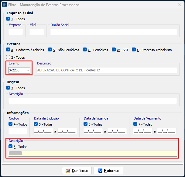 • O evento S-2206 será exibido em vermelho, indicando pendência de envio.