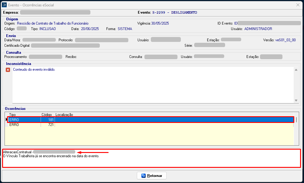 Ao clicar no Erro 181, geralmente a mensagem indicará uma Alteração Contratual, o que significa que existe um evento S-2206 (Alteração de Contrato) processado com data posterior à rescisão. Esse tipo de inconsistência é comum em casos de rescisão por término de contrato ou rescisão antecipada, em que o usuário envia a prorrogação do contrato ou a alteração para contrato por tempo indeterminado (S-2206) antes de transmitir a rescisão contratual (S-2299).