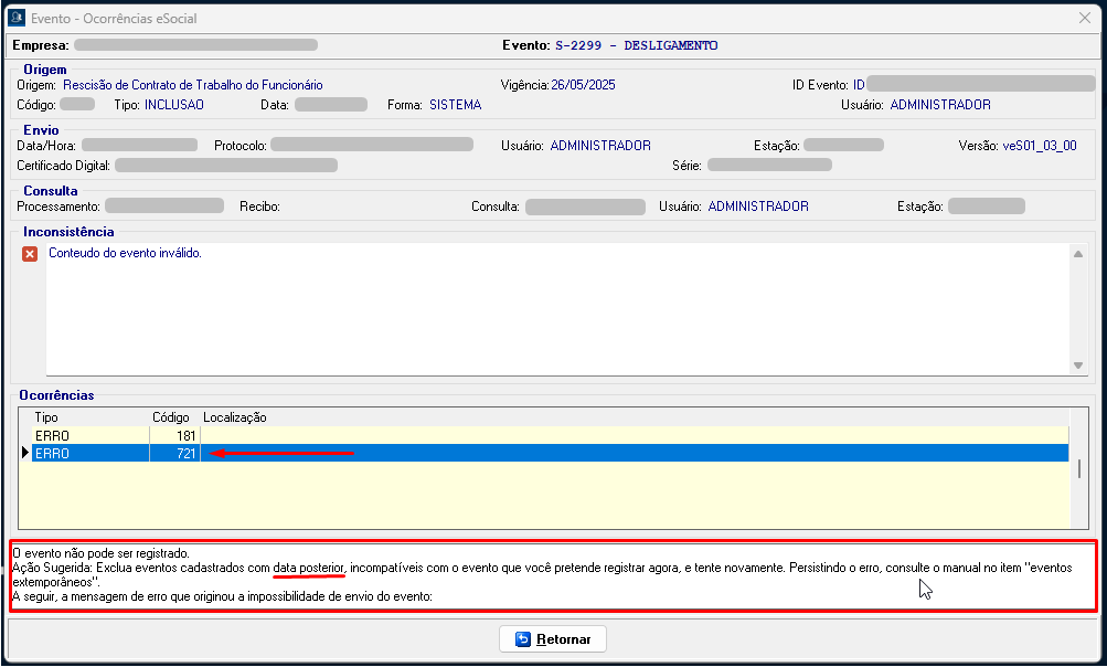 Na mensagem apresentada Erro 721, será informado que existem eventos registrados com data posterior à data do evento S-2299 (rescisão), o que é incompatível com a ordem cronológica exigida pelo eSocial.