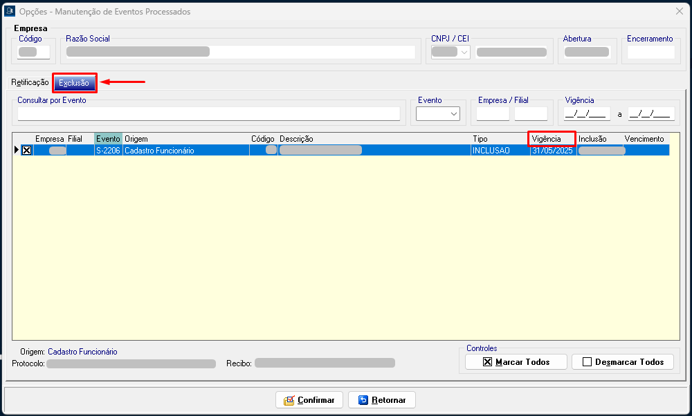 • Na coluna Vigência, localize o evento cuja data seja posterior à data de rescisão contratual.