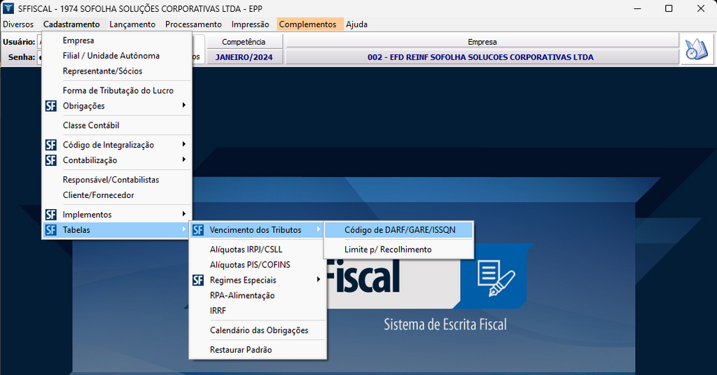 1. Na tela principal do sistema acesse o menu Cadastramento > Tabelas > Vencimento dos Tributos > Código de DARF/GARE/ISSQN;