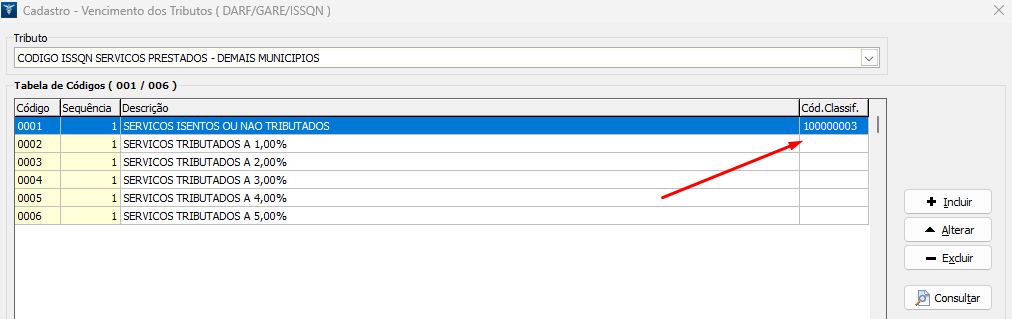 5. Ao confirmar, a Classificação Tributária ficará atribuída ao código de serviço em uso, conforme o exemplo;