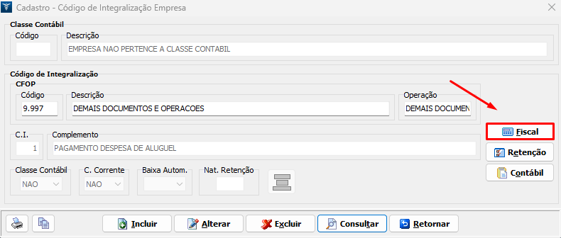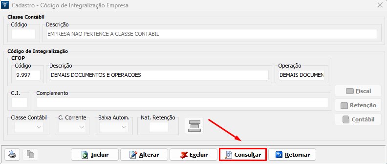 2. No campo Código, digite o CFOP desejado, clique em Consultar e selecione o C.I. que será utilizado;