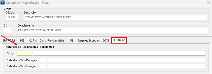 5. Clique na palheta EFD Reinf, pressione F9 no campo Natureza de Rendimentos (Tabela 01);
