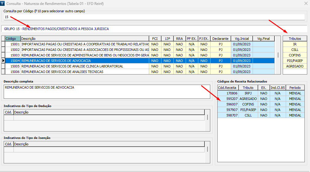 7. Observe o exemplo de consulta abaixo, informando o Código/Grupo 15 - Rendimentos Pagos a Pessoa Jurídica, automaticamente todos os códigos no grupo são listados. Poderá localizar de forma mais rápida e prática o CNR desejado;