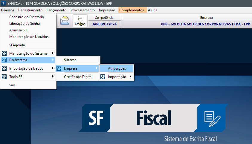 8. Acesse na tela principal do sistema o menu Diversos > Parâmetros > Empresa > Atribuições;