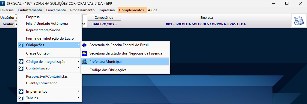 4. Acesse na tela principal do sistema o menu Cadastramento > Obrigações > Prefeitura Municipal, no rodapé da tela clique em Alterar;