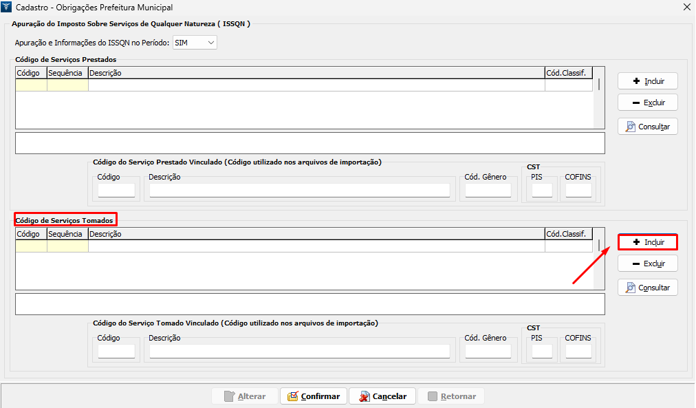 5. Na opção Código de Serviços Tomados, clique em Incluir ao lado direito;