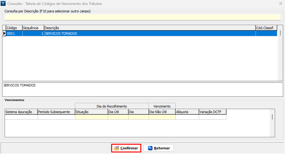 6. Na listagem apresentada, selecione o código de serviço cadastrado anteriormente, clique em Confirmar;