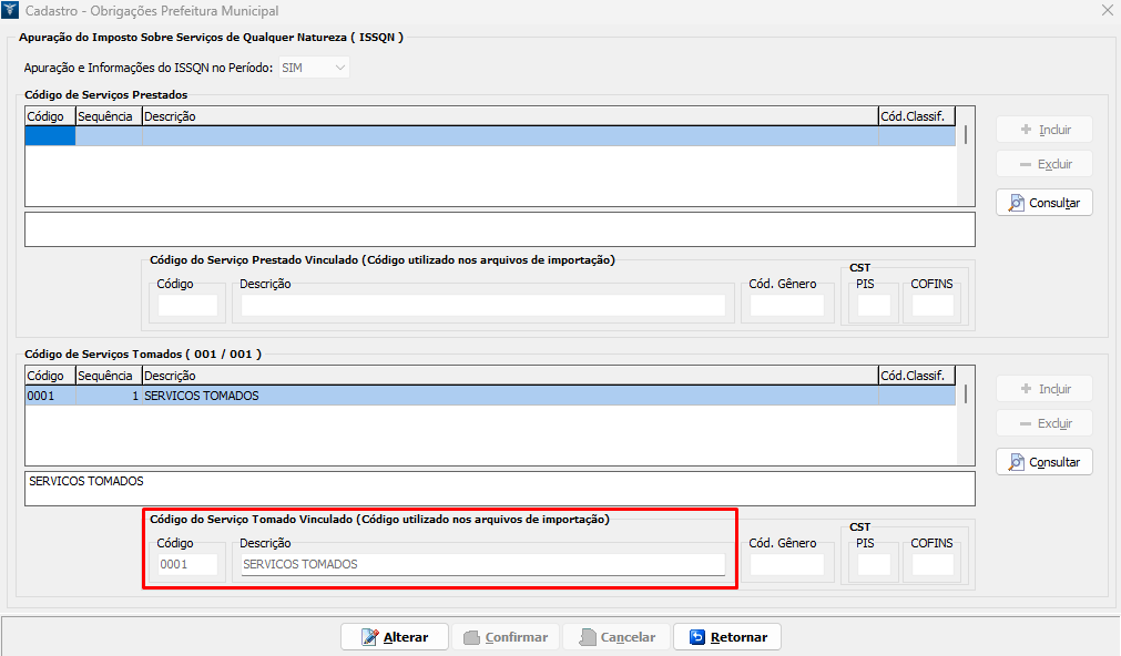 7. Em seguida, abaixo do campo Código de Serviços Tomados, verifique o campo Código do Serviço Tomado Vinculado, repita o código e descrição do serviço acima.