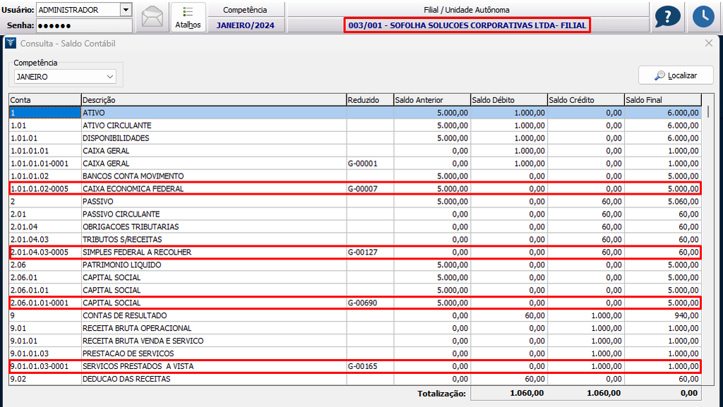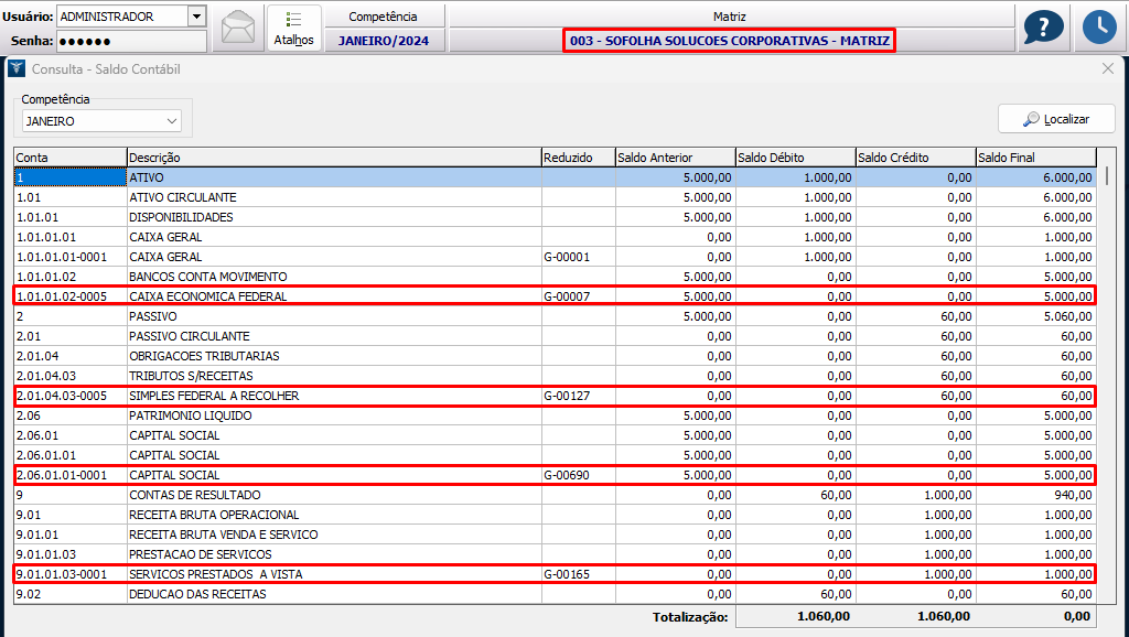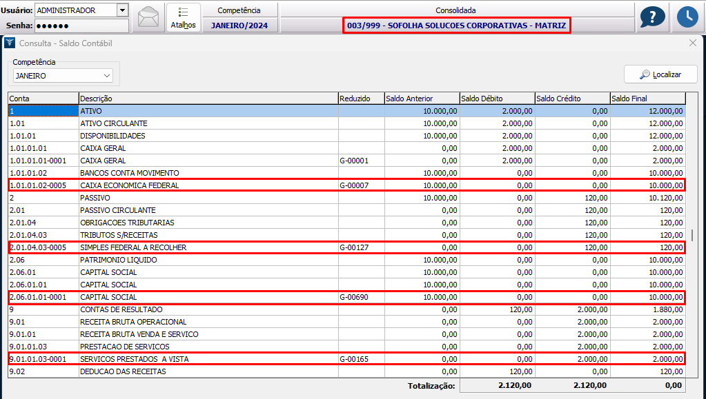 9. Acessando a matriz na contabilidade, pelo menu Processamento > Consulta de saldos, é possível visualizar os seguintes saldos: