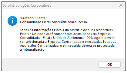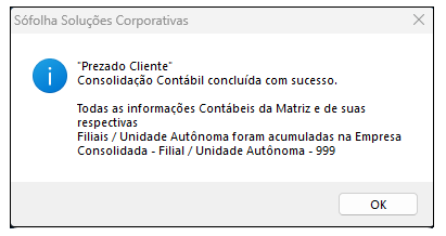 4. Em seguida, acesse o menu Processamento > Consolidação Matriz/Filial > Consolidar. Nesse processo, o sistema criará automaticamente uma filial com o código 999, a qual denominamos filial Consolidada. Nela, serão consolidados os lançamentos da matriz e de todas as filiais cadastradas no sistema;