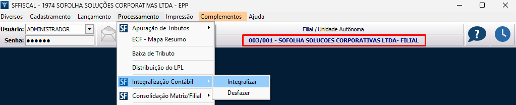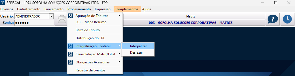 6. Em seguida, em Processamento > Integralização Contábil > Integralizar, envie as informações para o SFContábil de todas as empresas: matriz, filiais e empresa consolidada;