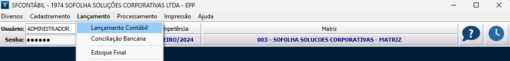 7. Na tela principal do sistema, acesse Lançamento > Lançamento Contábil. Se houver lançamentos contábeis para registrar, faça isso em cada empresa correspondente;