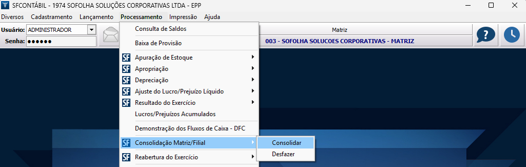 11. Ainda na filial, realizamos a consolidação contábil acessando o menu Processamento > Consolidação Matriz/Filial > Consolidar;