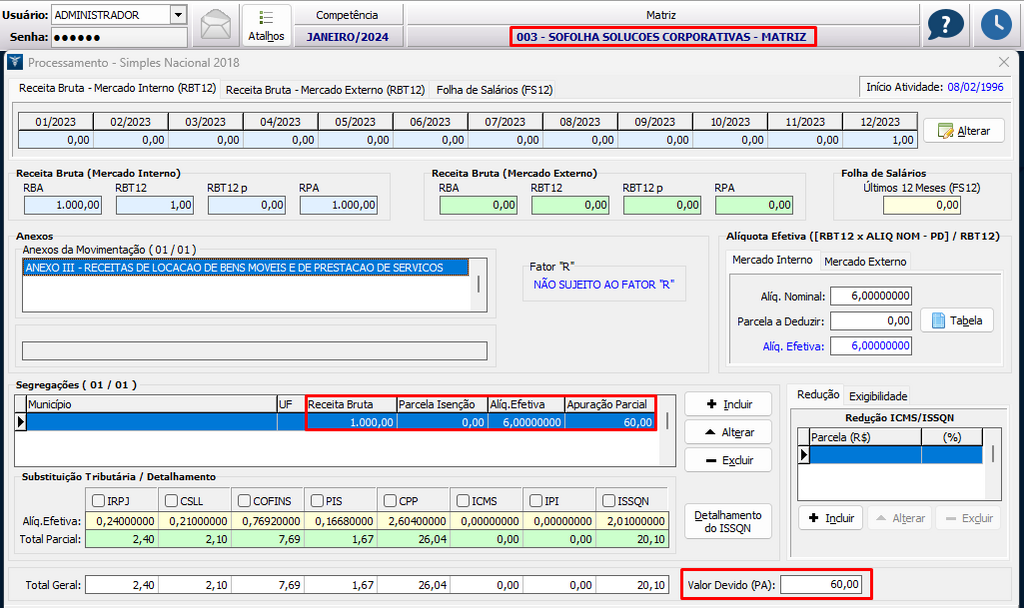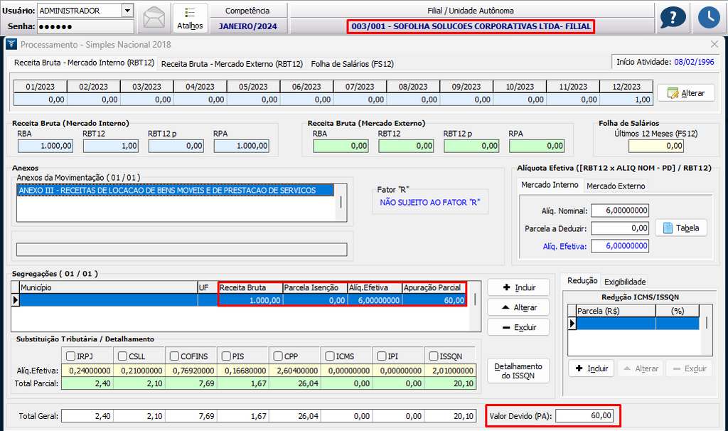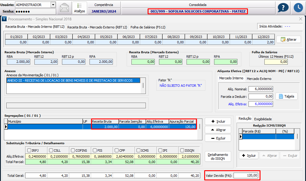 Simulação efetuada na competência 01/2024