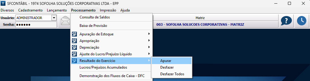 9. Recomendamos efetuar o processo mensalmente, conferindo os saldos. No entanto, também é possível consolidar os dados selecionando o período desejado. Ao final do exercício e/ou conforme o fechamento contábil da empresa (trimestral ou anual), é possível encerrar o balanço da matriz, da filial e da empresa consolidada, acessando o menu Processamento > Resultado do Exercício > Apurar.