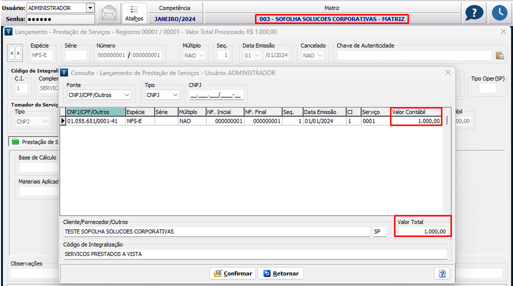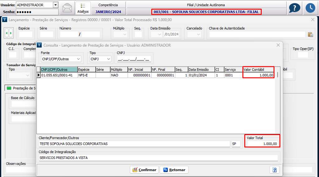 3. Na filial, também efetuamos a escrituração do lançamento de serviço prestado no valor de 1.000,00